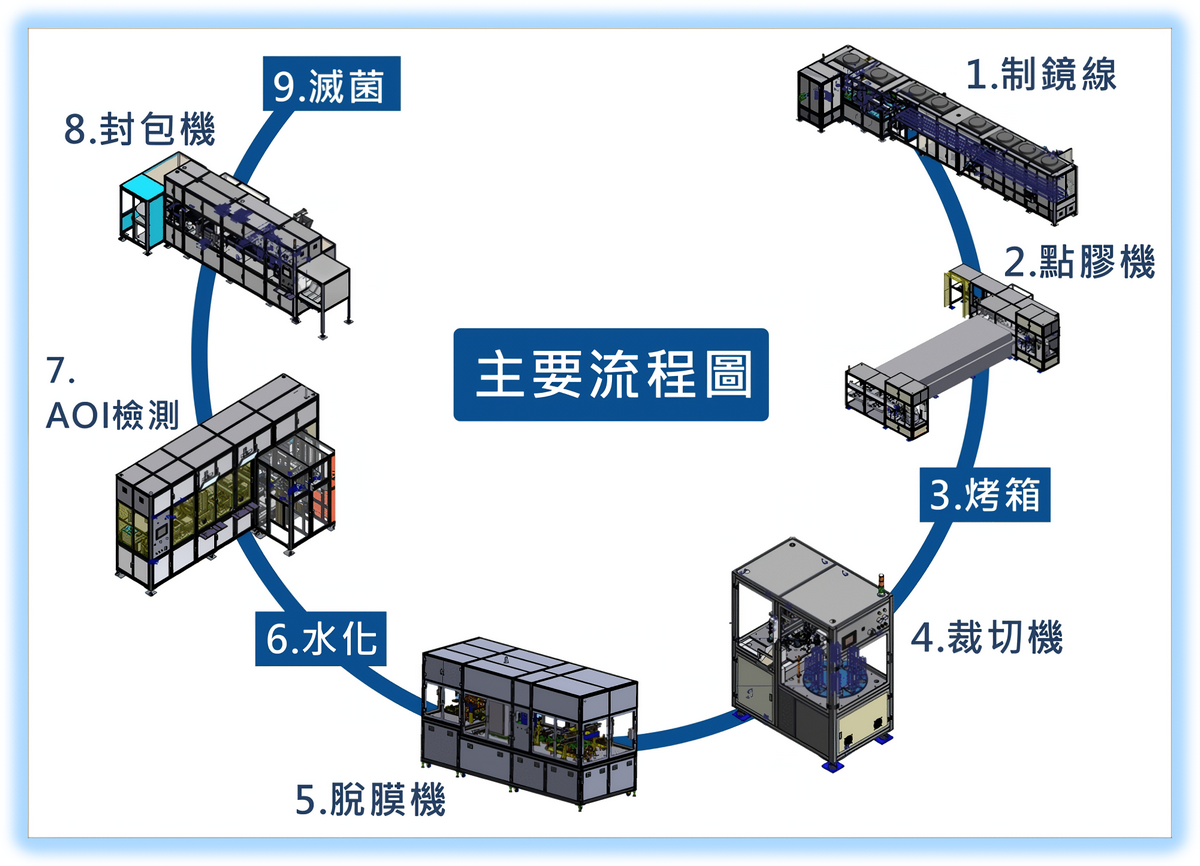 隱形眼鏡自動化製程設備 自動化隱形眼鏡製造設備 製鏡線 自動化隱形眼鏡製造設備 點膠機 自動化隱形眼鏡製造設備 裁切機 自動化隱形眼鏡製造設備 移印機 自動化隱形眼鏡製造設備 脫模機 自動化隱形眼鏡製造設備 AOI檢測 自動化隱形眼鏡製造設備 封包機 自動化隱形眼鏡製造設備 鋼板雷射雕刻機 自動化隱形眼鏡製造設備 鋼板檢測機 自動化隱形眼鏡製造設備 四色移印機